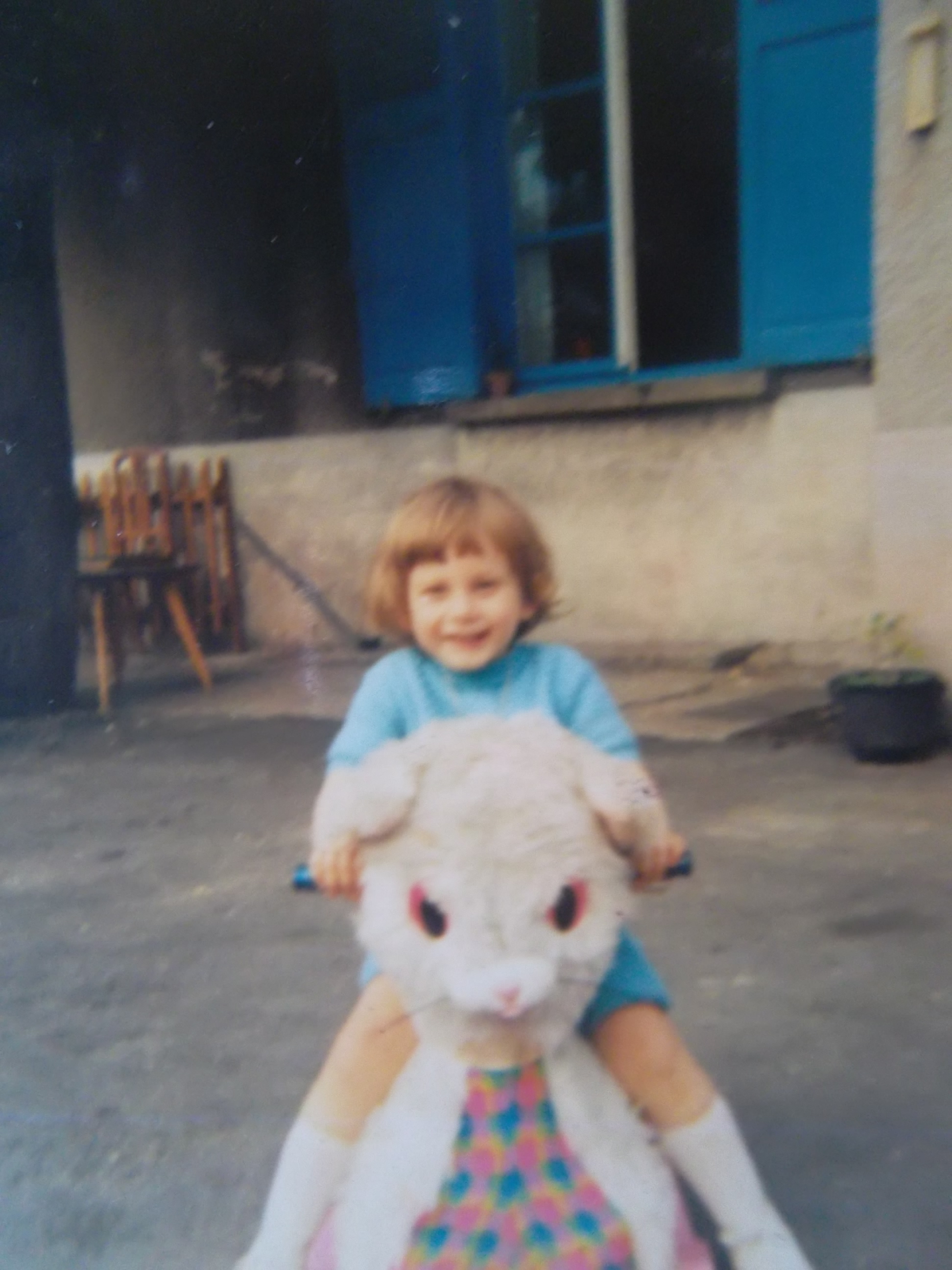 Tout de bleu vêtue, les gambettes à l'air (assortie aux volets en plus !!!) , on note les chaussettes bien remontées et le chat à bascule ... On s'amuse, on s'amuse ! Et déjà un semblant de coupe de cheveux à "la Stone" que j'ai trainé pendant des années, l'horreur absolue !!!