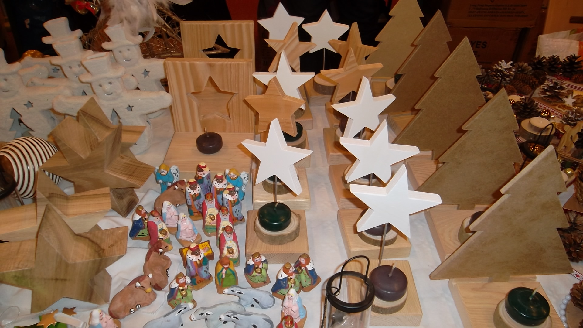 marché de noel créations bougeoir en bois étoiles sapins bonhomme de neige d ouest en elfes créations